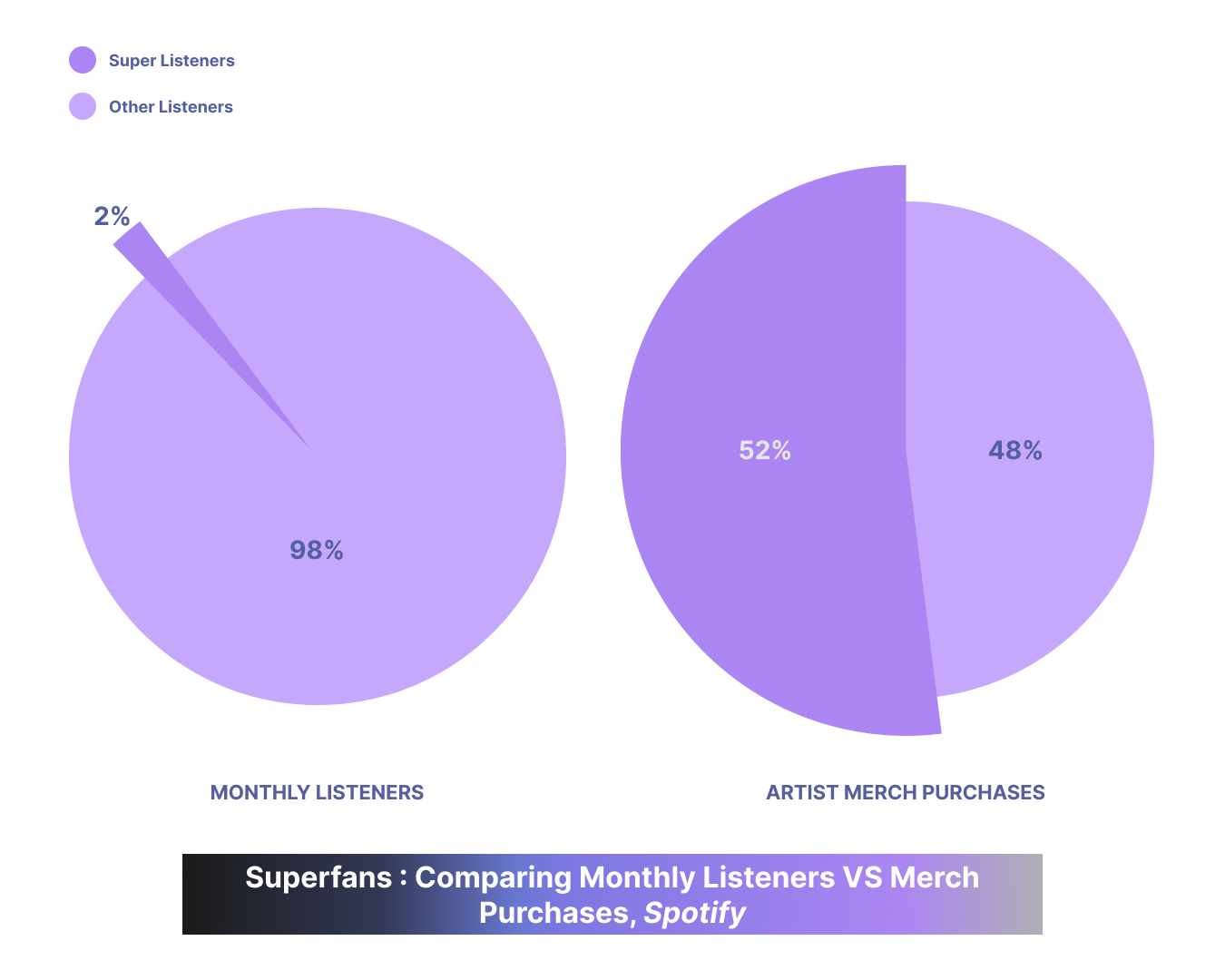 - Superfans constitute around 2% of an artist's monthly listeners. However, they account for 18% of monthly streams and 52% of merch buyers, Spotify