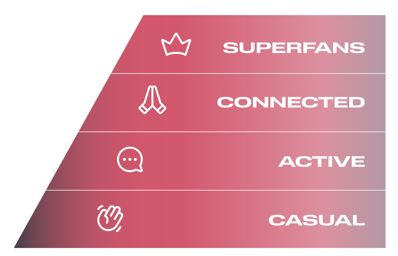 Before defining the term superfan, let’s take a look at other types of fans that can be ranked into a pyramid. At the base are casual fans, who represent the majority of an audience but are minimally engaged. Then come active fans who follow an artist across various platforms. Next are the connected fans, forming an invested and engaged community. And at the top are our superfans.